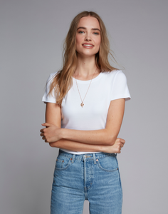 "You will not find a better t shirt. Scoop isn’t too low. Feminine, flattering fit. True to size. White isn’t see through."