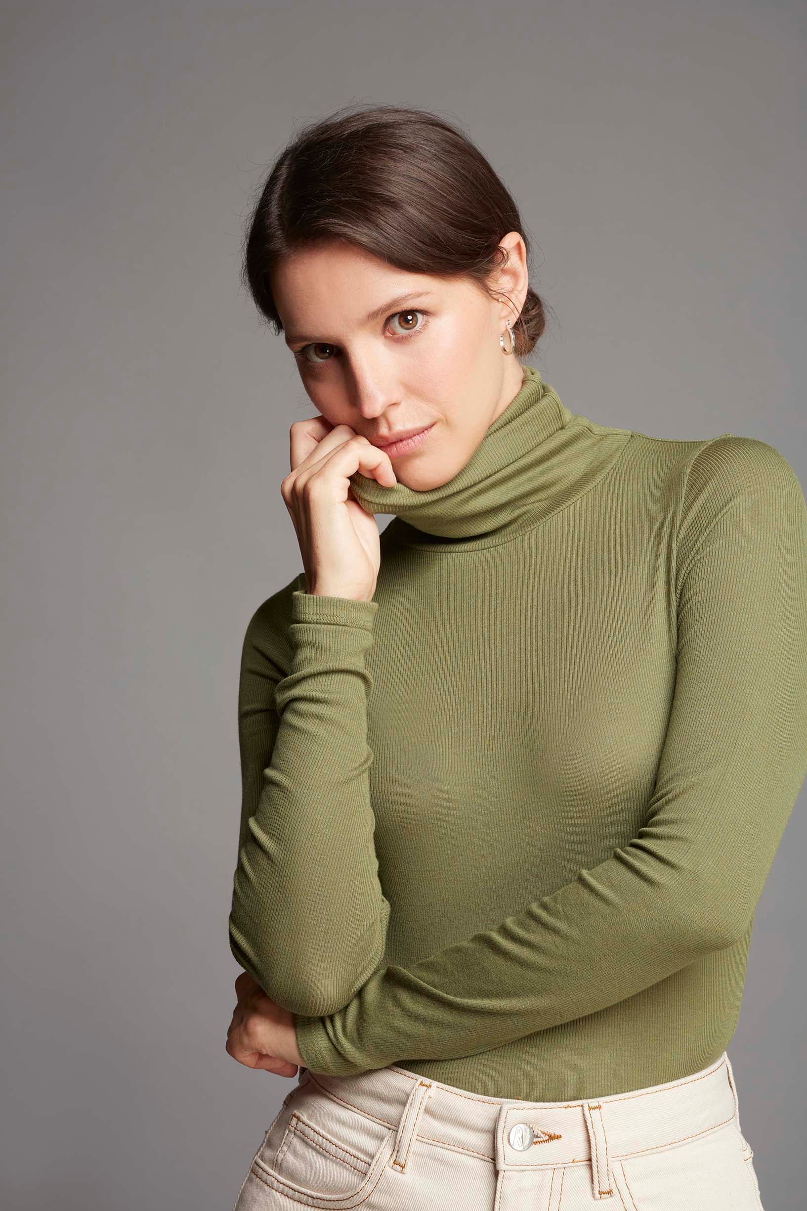 Green Silk Rib Roll Neck Top by Lavender Hill