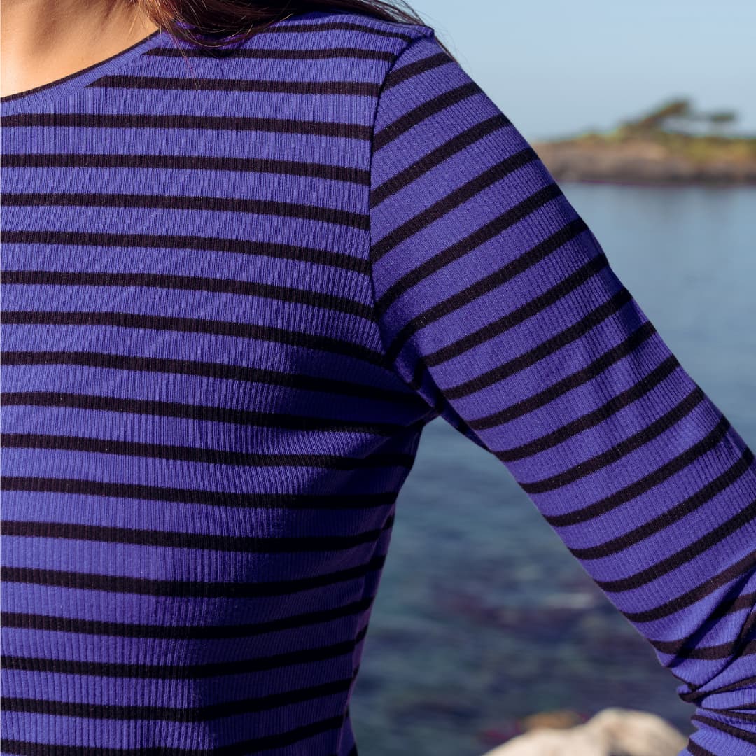 The striped pattern and crew neck design transition seamlessly from casual to formal settings.